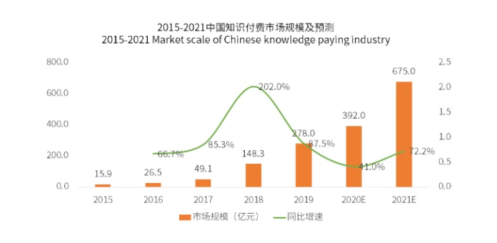 2015年到2021年,中国知识付费市场呈爆发增长,增长格外显著的年份包含:2017年同比增长46%、2018年同比增长67.09%,以及2019年同比增长45.76%。