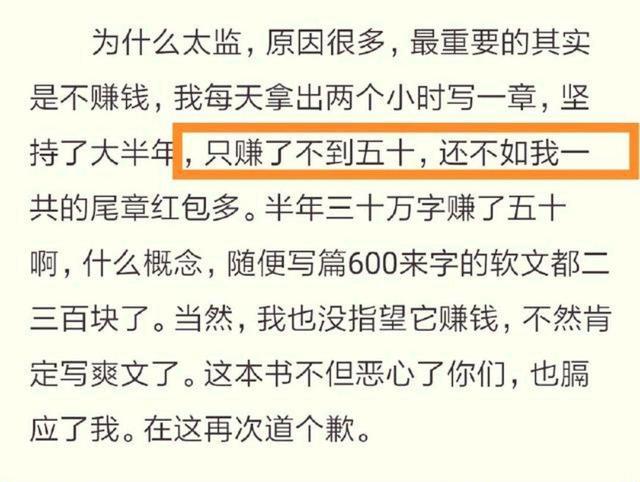 还有一位因陷入资金困境而断更的作者,借由小说发布声明:为什么太监?坚持了大半年(累计写作30万字),只赚了不到50元,这是什么概念?随便写篇600字软文,都二三百块了。这本书不但恶心了你们,也膈应了我。