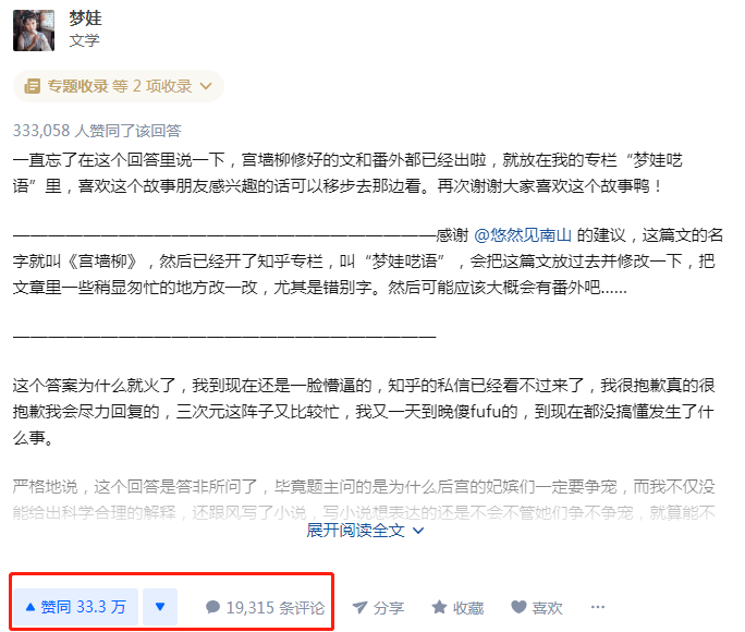 大家到底多喜欢网文风?可以回顾2019年4月,梦娃发布宫斗小说《宫墙柳》,其脱胎于提问“为什么后宫中嫔妃们一定要争宠?”,作者用大半年时间,将其连载成十几万字的小说,目前已累计获得赞同33.3万,是当年现象级的一部短篇小说。