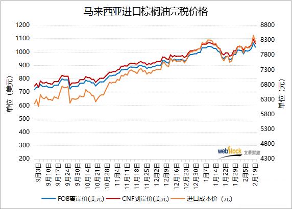 2月19日马来西亚棕榈油离岸价为1035美元,较上日跌30美元,进口到岸价为1062美元,较上日跌30美元,进口成本价为8246.69元,较上日跌201.85元。因市场担忧需求下降,且马来西亚上调3月出口税率的参考价,马来西亚BMD毛棕榈油期货周四跌至一周低位,回吐上一日涨幅,棕榈油进口成本跟盘大幅走低。