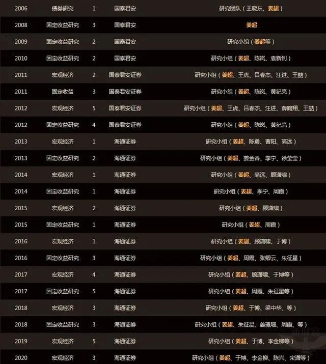 此外,姜超也曾多次在新财富最佳分析师评选中斩获榜首。2006年,在国泰君安任职期间获新财富债券研究第一名团队;在海通证券任职期间,则分别在2013年和2014年获得宏观经济研究小组第一。同样是在2014年,姜超还获得固定收益研究团队第一名;2015年,姜超获固定收益研究第一名;2016年,获宏观经济研究第一名。