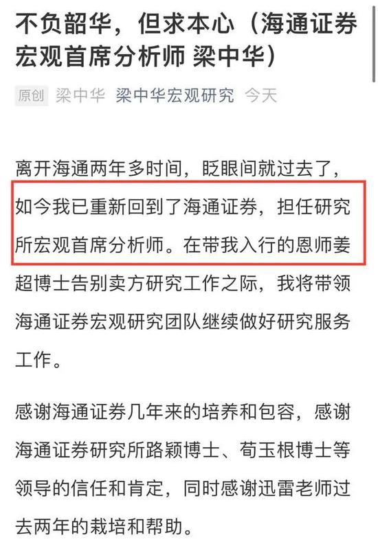 2月18日,梁中华在其微信公众号上发文称:“已重新回到海通证券,担任海通证券研究所宏观首席分析师。”