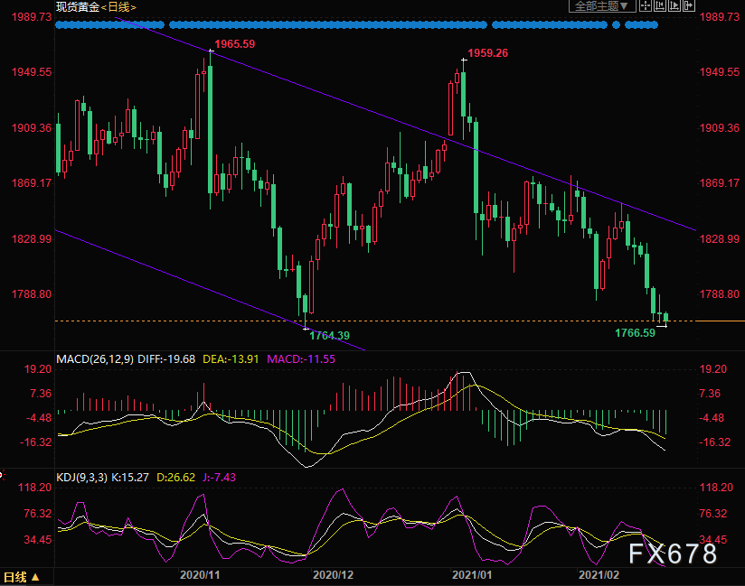 周五(2月19日)亚洲时段,现货黄金小幅下跌,交投于1767附近。周四(2月18日)金价几乎持稳,徘徊在11周低点附近,整日交投振荡,因投资者对全球经济复苏的乐观情绪推高美国公债收益率,令黄金吸引力下降。另外疫情增速放缓至10月以来最慢进一步打击了黄金避险盘,但初请失业金人数意外增加及民主党快速推进刺激案给金价提供了部分支撑。短线金价进一步跌破11月30日支撑位1764,可能继续下探1700支撑位。