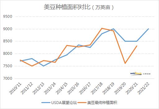 强劲需求推动CBOT大豆及玉米价格创下多年高位,新季种植面积增加也在市场预料之内。从近11年以来展望论坛预估数据来看,除了2019/20出现明显偏差之外,其余年份均与实际种植面积相差不多,2021年美国大豆种植面积将远远高于2020年。