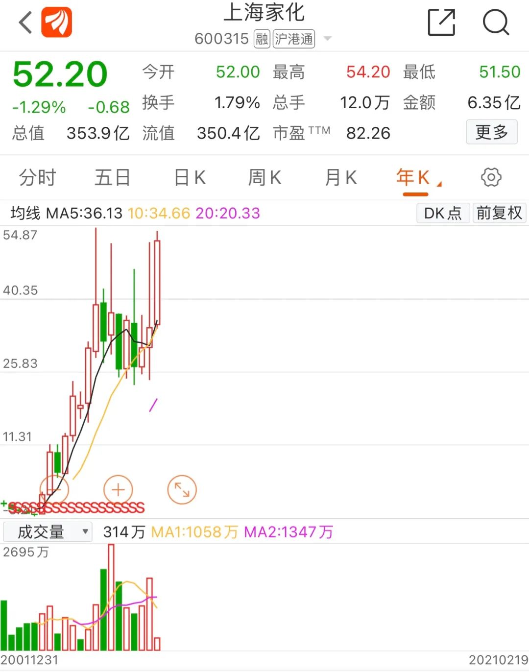 上海家化开年以来大涨50%。上海家化2月2日发布的年报显示,该公司旗下的玉泽、家安、双妹等品牌高速增长,其中由上海交大瑞金医院专家与上海家化联合研制的玉泽去年全年就实现了200%的增长。除菌产品家安获得约30%增长,2020年重启品牌新形象的双妹增长约70%,连续下降多年的佰草集、美加净和高夫品牌呈现出改善态势。