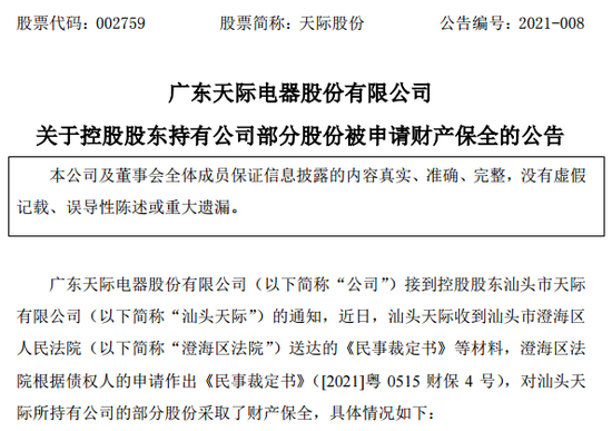 天际股份2月19日下午披露,近日,汕头天际收到汕头市澄海区人民法院(以下简称澄海区法院)送达的《民事裁定书》等材料,澄海区法院根据债权人的申请作出《民事裁定书》,对汕头天际所持有公司的部分股份采取了财产保全。