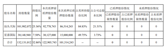 虽然历经多轮被动减持,但汕头天际的股权质押比例依旧高企。截至2月2日,汕头天际累计质押股份数量8651.42万股,占其所持上市公司股份数量比例位84.83%。星嘉国际的股权质押比例则为49.75%。