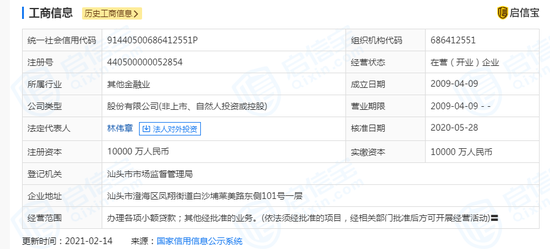 启信宝显示,兴信小贷成立于2009年,注册资本1亿元。兴信小贷董事长为林伟章,林伟章曾是*ST群兴(002575.SZ)实际控制人、董事长。