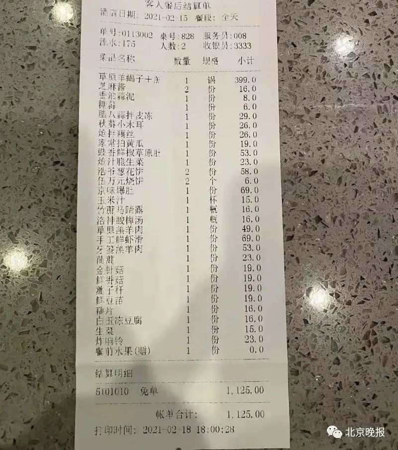 蔡超杰介绍,两个人一共点了20多种涮品和凉菜,总计1125元。事发时,这些菜很多都没有动。当时,餐厅对顾客进行了赔礼道歉,并进行了免单处理,还将顾客没动的菜品打了包。但是,顾客并没有将打包的菜品带走。
