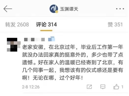 这是谭主微博发起征集活动的评论区,点赞最多的一条不返乡手记。