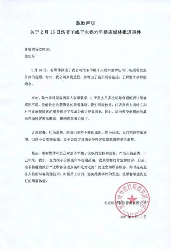 蔡超杰介绍,引导顾客合理点餐是他们的一项服务流程。从顾客落座,服务员就会向顾客介绍店内有小份锅底和半份菜,让顾客能够明白消费,避免浪费。“这名服务员当时只是在按照公司的服务流程进行服务,毕竟大家都不希望看到浪费在自己的店里发生。”