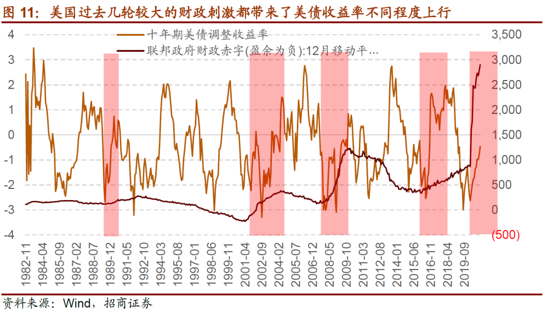 美国加强财政政策一方面会加大国债的供给,另一方面,也会强化经济复苏和通胀预期,推高美国十年期国债利率。
