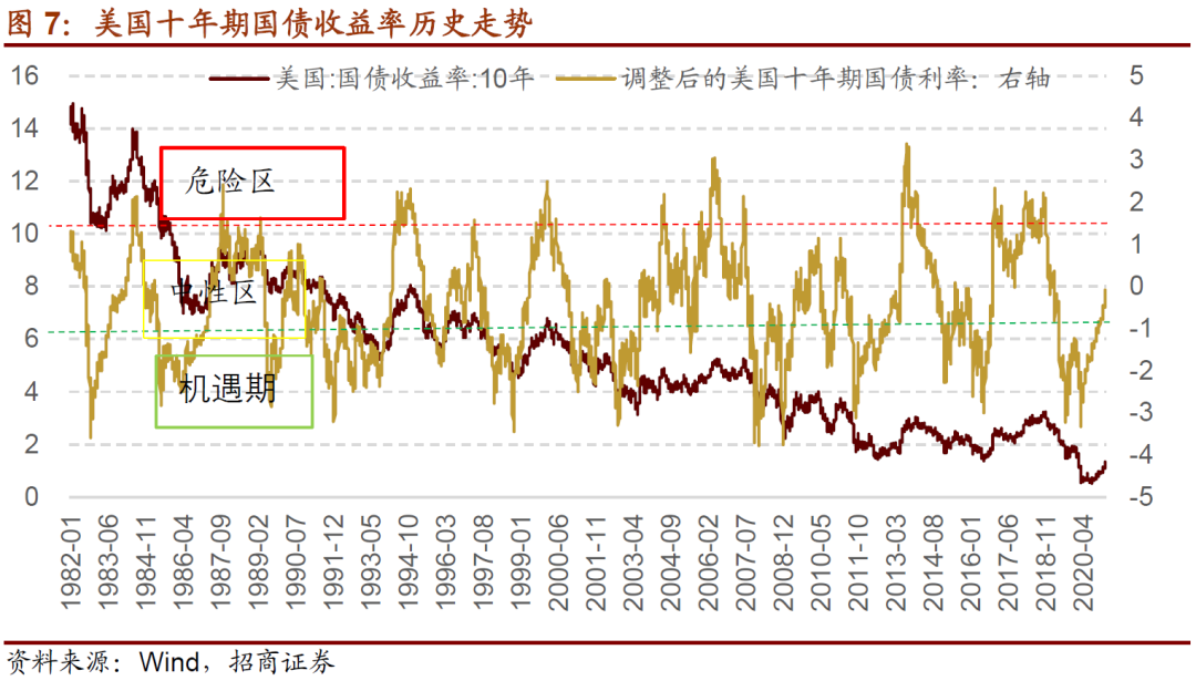 当调整后的美国十年期国债收益率超过-1%,则说明利率下行了一段时间,下行的幅度较大,货币环境较为宽松,进入机会较大的区域,我们称之为“机遇区”;