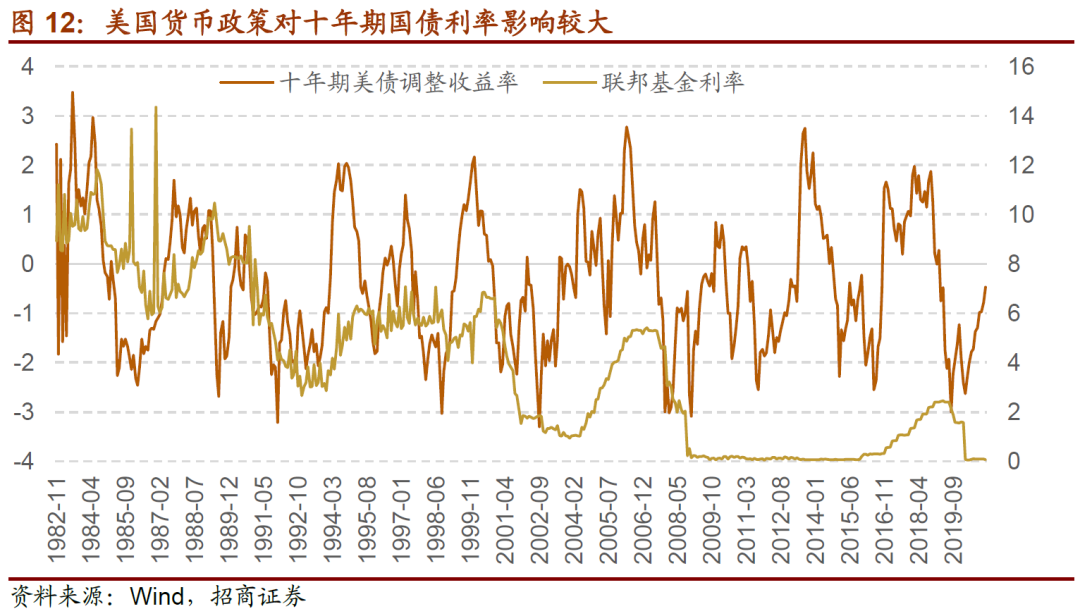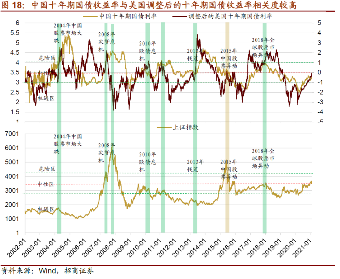 同时,由于汇率稳定机制和全球经济的高相关性,中美货币政策也存在一定的同步,因此在美债收益率快速上行的阶段,在前面我们描述的每四到五年,有些时候是其他国家资本市场的调整,A股也出现不同程度调整。