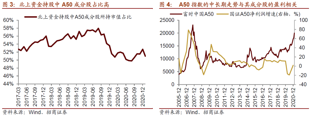 对于A50指数期货定价来说,趋势上,主要由A50指数的表现来决定。2016年之前,外资对A50的影响较小,2016年之后,外资通过陆股通不断加仓A股,其中,A50指数成分股占比较高,因此,北上资金的流入流出对于A50指数短期走势开始产生越来越大的影响。但是,从中长期角度来看,A50指数表现取决于中国经济和A50指数成分股的盈利情况。