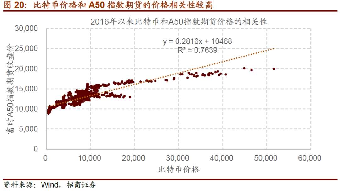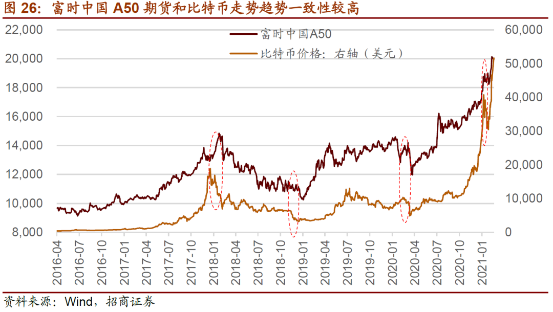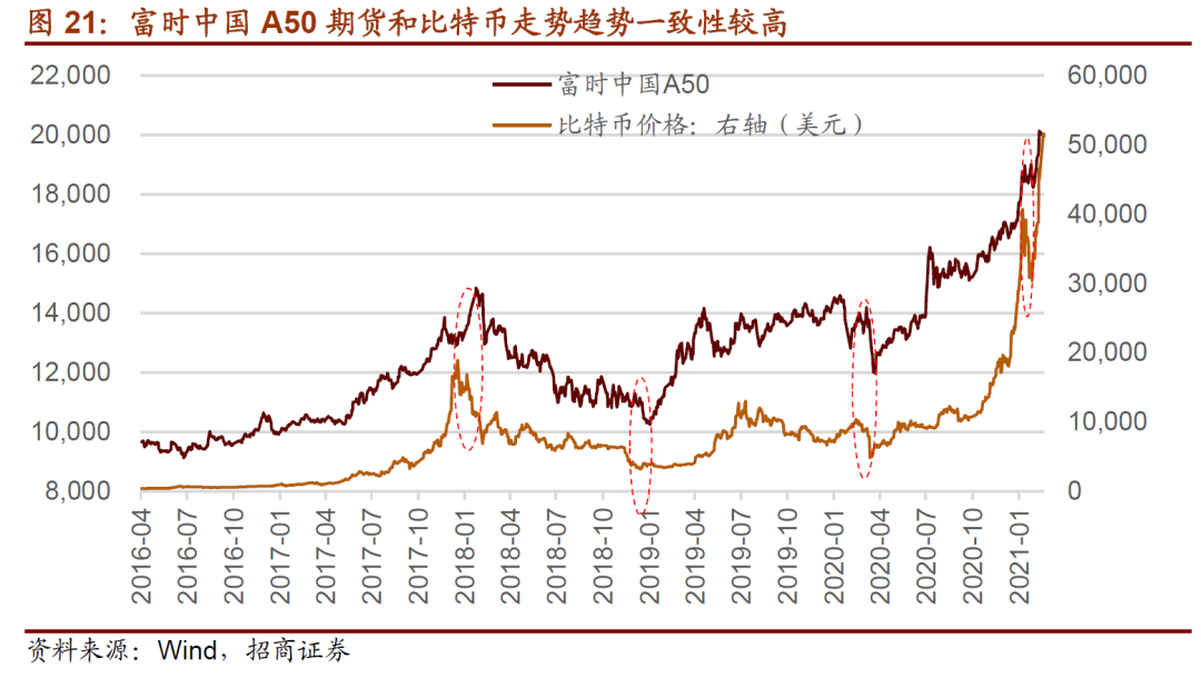 相比富时A50指数期货,比特币是没有底层资产的,且比特币没有使用价值,因此,比特币是一个较为纯粹的反映流动性的品种。而富时A50最终还是以A50成分股的价格作为交割依据,而A50成分股的价格在A股定价,虽然外资有一定的影响,但主要取决于国内投资者对A50成分股的定价,受到A50成分股盈利、国内流动性和风险偏好的影响。