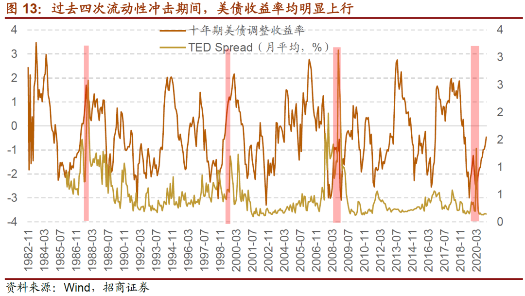当美国或者全球股票市场遭遇外部冲击出现大幅下跌时,由于赎回需求、杠杆资金平仓、补仓等需求大幅增加,会使得投资者抛售一切资产来获得美元应对流动性需求。此时,会出现短期流动性的大幅增加,体现为Ted Spread(三月期伦敦银行间市场利率(LIBOR)与三月期美国国债利率之差)短期内大幅飙升,此时,十年期国债作为一种资产,也会无差异被抛售,造成十年期国债利率的大幅回升。