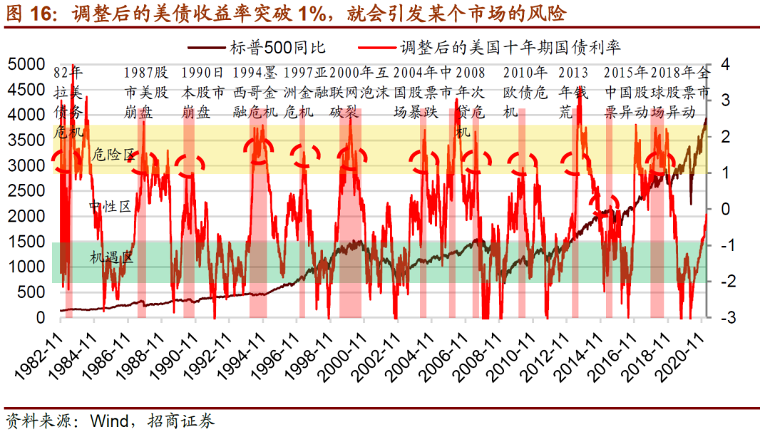 ⚑美股与美债收益率:从1982年以来,调整后的美债收益率每隔三到四年就会突破1%进入危险区域,每次几乎都会引发某一个国家的股票或者货币大跌,美股由于风险偏好下降不同程度调整。