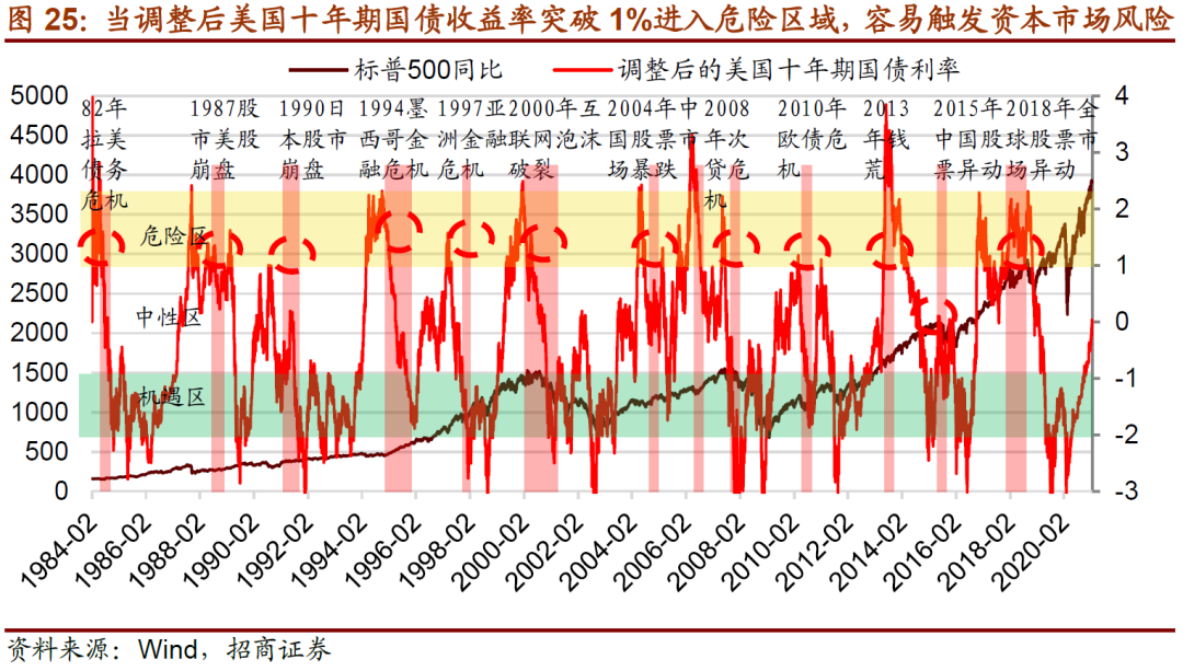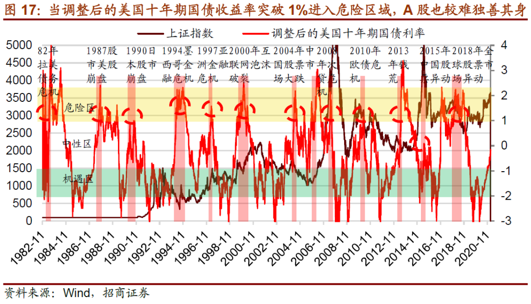 当调整后的美国十年期国债收益率超过1%,则说明利率上行了一段时间,上行的幅度较大,进入风险较高的区域,我们称之为“危险区”;
