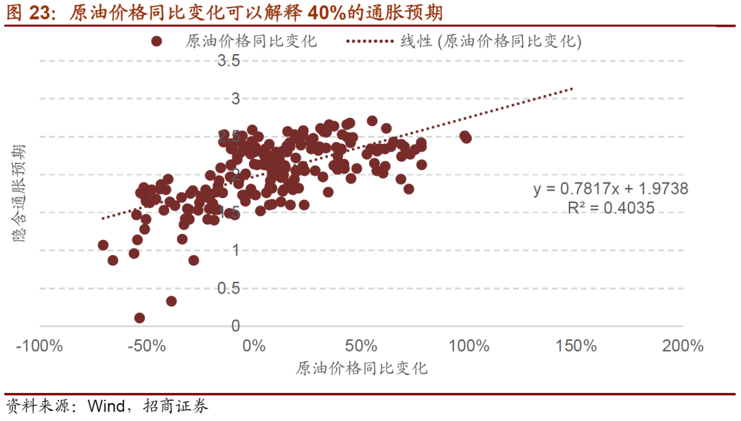 ⚑油价与美债:油价上涨推升隐含通胀预期,带动十年期国债收益率上行,原油价格同比变化可以解释40%的通胀预期。