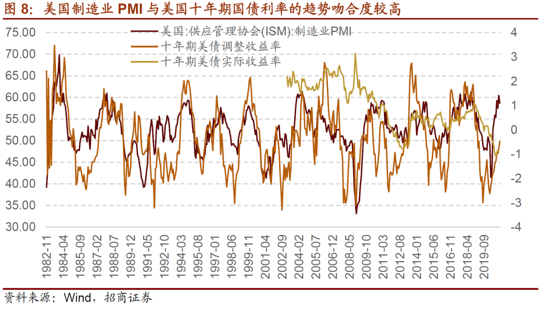 用制造业PMI作为经济预期的代表,我们会发现美国的制造业PMI与美债调整之后的收益率相关度比较高。对经济景气的预期,更多的是影响实际利率。