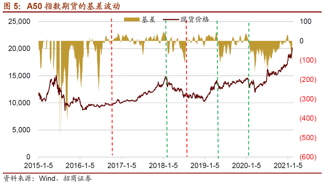 和所有期货类似,富时中国A50指数期货最终是以现金结算,最终结算价将是富时中国A50指数的官方收盘价,精确到两位小数点。因此,富时中国A50指数期货走势长期来看和富时中国A50指数走势一致,但是在到期日之前,富时中国A50指数期货可能会偏离富时中国A50指数,体现为基差的波动。