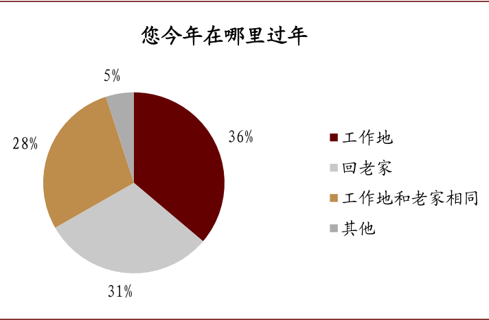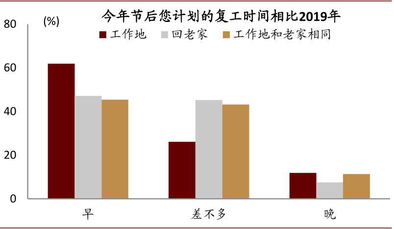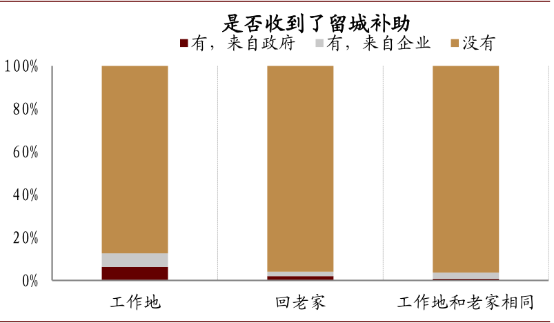 就地过年复工早。绝大部分被调查者都没有收到留城补助,但是就地过年的被调查收到留城补助的比例更高,达13%;其中来自政府和企业的比例都为6%。问卷调查结果显示,就地过年或使节后复工时间有所提前。对于复工时间较为灵活的人群,就地过年有助于使得节后复工时间提前:就地过年的被调查中,选择复工时间更早的比重为62%,高于回家过年以及工作地和老家相同的两类人群。