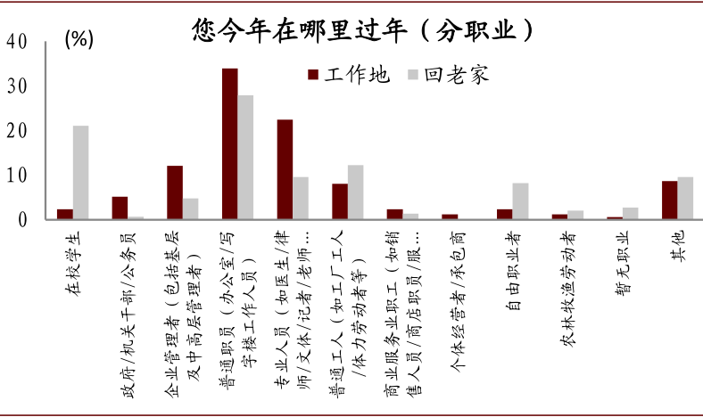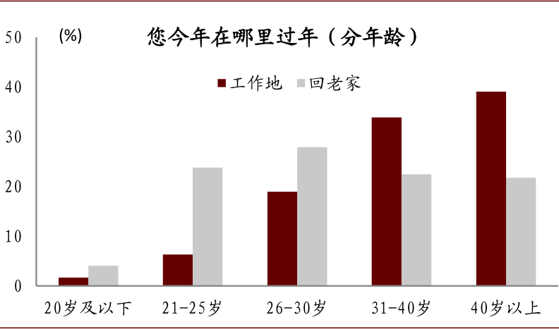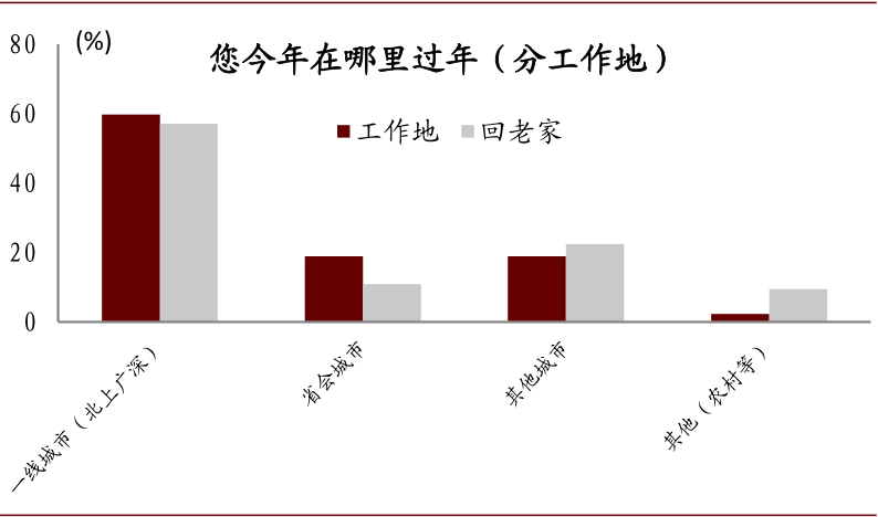 我们的线上问卷调研结果补充了线下未能充分了解的情况。调研结果显示年纪越轻,回老家过年的可能性就越大;城市能级越高,就地过年的可能性越大。从花销来看,整体排名前三的是网购年货、外出就餐和线下购物,就地过年显著花费更多的是外出就餐、电影院看电影和外卖。留城补助有助于提升就地过年比重,不过绝大部分被调查者未收到留城补助,但就地过年的被调查者中收到留城补助的比例更高。被调查对象多数预计就地过年或使节后复工时间提前,就地过年的被调查中,选择复工时间更早的比重为62%,高于回家过年以及工作地和老家相同的两类人群。