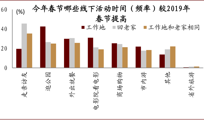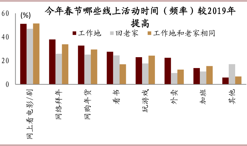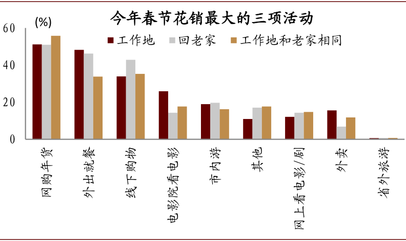 从花销来看,整体排名前三位的是网购年货(53%)、外出就餐(43%)、线下购物(37%),而就地过年的宅家时间相对较多。整体来看,就地过年相比回老家过年以及工作地和老家相同这两类人群,宅家时间有所增加:就地过年增加宅家时间的比重分别为52%,而其他两类宅家时间增加的比重平均为32%。从线下活动时间来看,就地过年显著减少了走亲访友,但增加了逛公园、电影院看电影、商场购物、市内游等其他活动。从线上活动时间来看,就地过年显著增加了网络拜年、网购年货、看书、外卖等活动。就地过年显著花费更多的是外出就餐、电影院看电影和外卖。