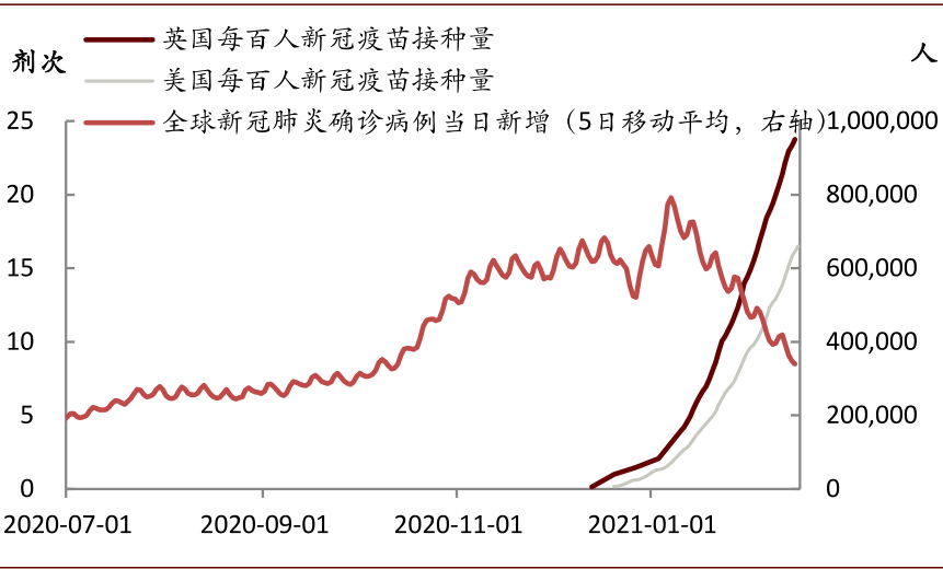 图表: 英美疫苗接种加速,全球新冠肺炎日度新增持续回落