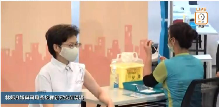 报道称,穿香港飞龙短袖上衣的林郑月娥于下午2点半过后已接种疫苗。