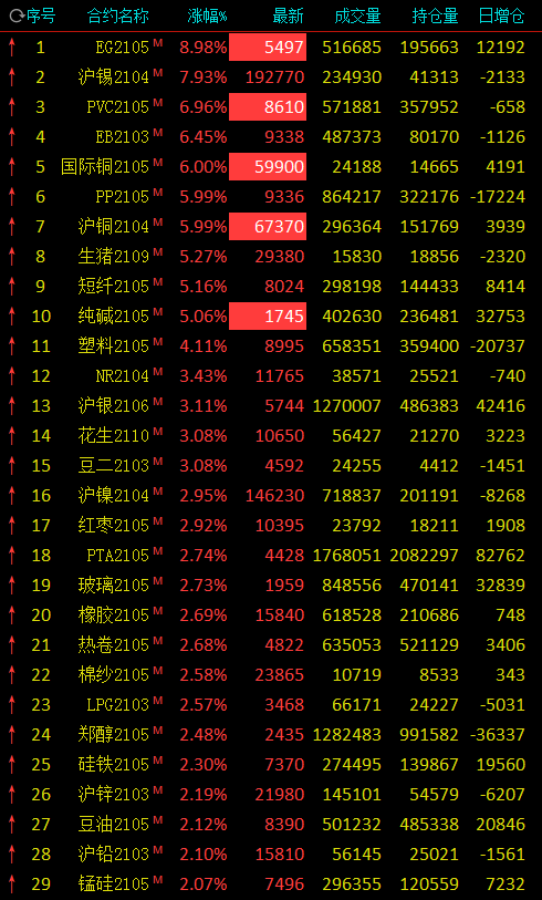 热点栏目2月22日,国内商品期市收盘涨声一片,有色金属、能化品掀起涨停潮,沪铜、国际铜、乙二醇、PVC、纯碱涨停,沪锡涨近8%,盘中一度涨停;聚丙烯涨6%,生猪、短纤涨超5%。双焦逆市走弱,焦煤跌近5%,焦炭跌4%。贵金属走强,沪银涨逾3%,沪金涨近1%。