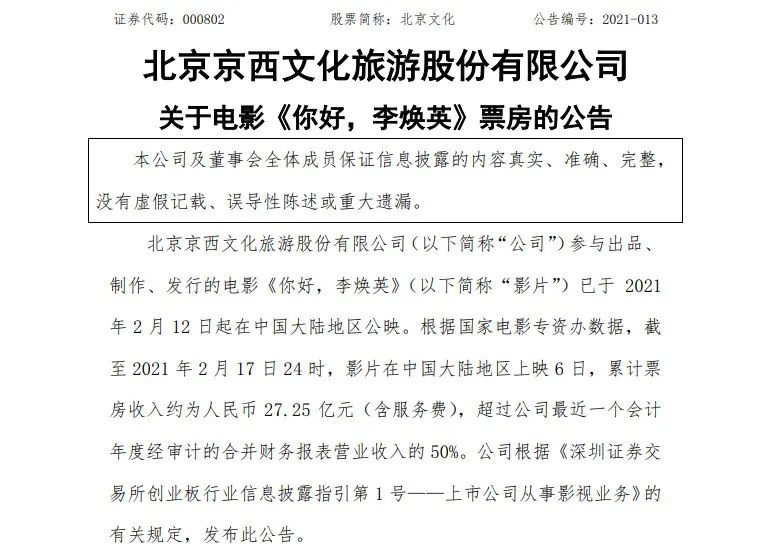 排在出品方名单第一位的北京文化在2月18日晚还披露了得益于《你好,李焕英》的相关营收。
