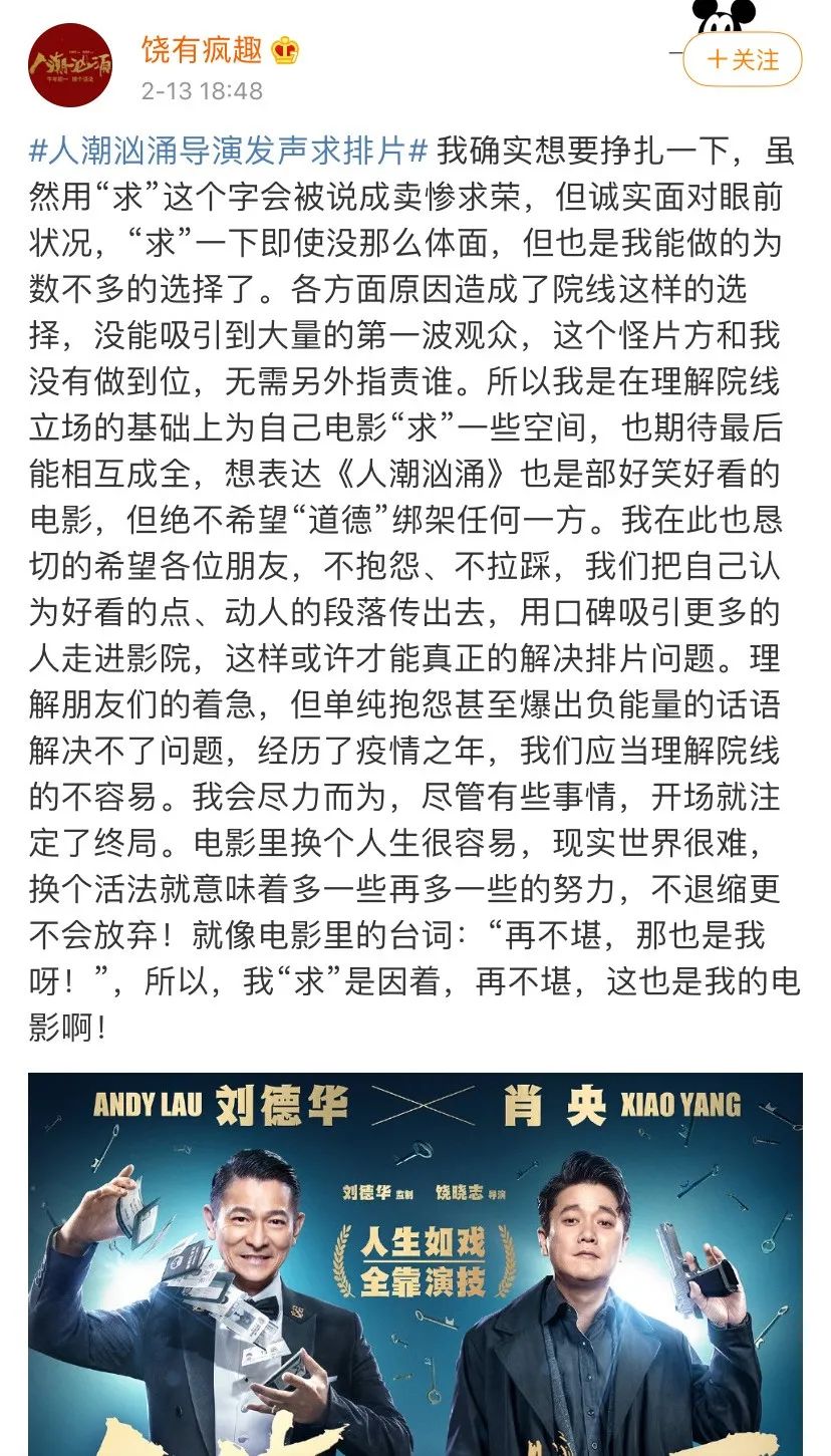 “各方面原因造成了院线这样的选择,没能吸引到大量的第一波观众,这个怪片方和我没有做到位,无需另外指责谁。所以我是在理解院线立场的基础上为自己电影‘求’一些空间,也期待最后能相互成全。”饶晓志说。