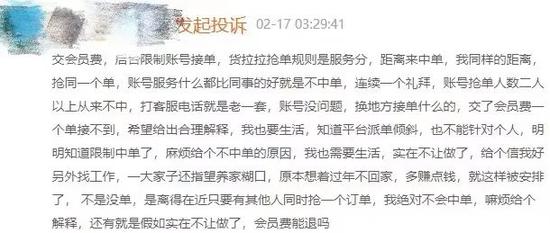 此前有货拉拉司机在黑猫投诉平台上发起投诉,交了会员费也一个单接不到,希望平台能给出合理解释,“我也要生活,知道平台派单倾斜,也不能针对个人,明明知道限制中单了,麻烦给个不中单的原因”。
