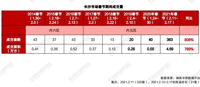 湖南中原研究院昨日发布的数据显示,2021年2月第2周,长沙市内五区一手住宅成交963套,成交面积12.65万平方米,环比分别下跌40%、39%;2月第3周,一手住宅成交490套,成交面积6.27万平方米,环比分别下跌49%、50%,但牛年新春,长沙市内五区的商品住宅成交量接近去年同期的8倍,并刷新了近八年的最高纪录。