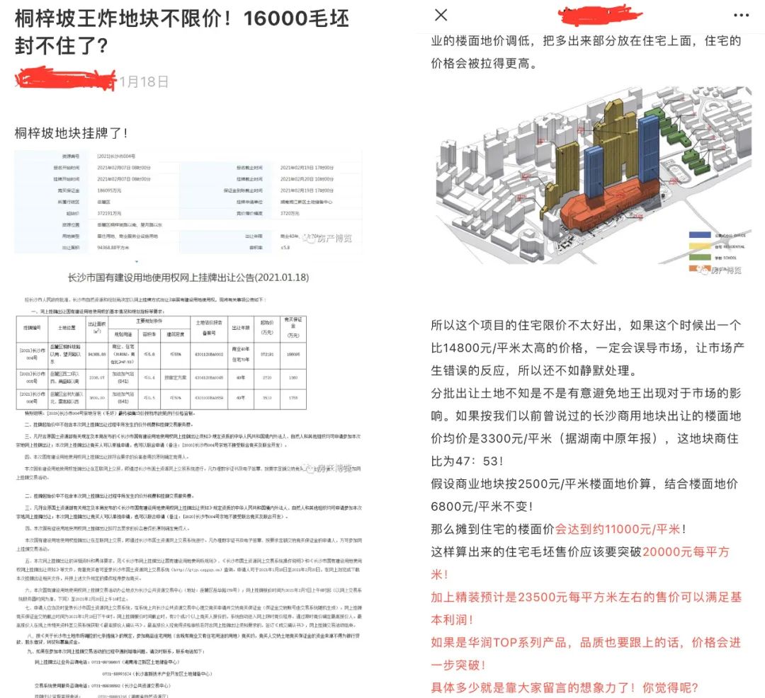 该宗编号为[2021]长沙市004号的商住用地,自今年1月18日挂牌,到2月20日挂牌截止。虽然其以起始楼面价约6800元/平方米的底价成交,住宅(毛坯)最高销售均价暂未确定、将按长沙市政策进行价格监制,但长沙部分自媒体热衷炒作房价上涨预期,从挂牌前后猜测的住宅毛坯均价超过16000元/平方米,到挂牌出让后预测住宅毛坯售价将突破20000元/平方米,加上精装或达23500元/平方米。