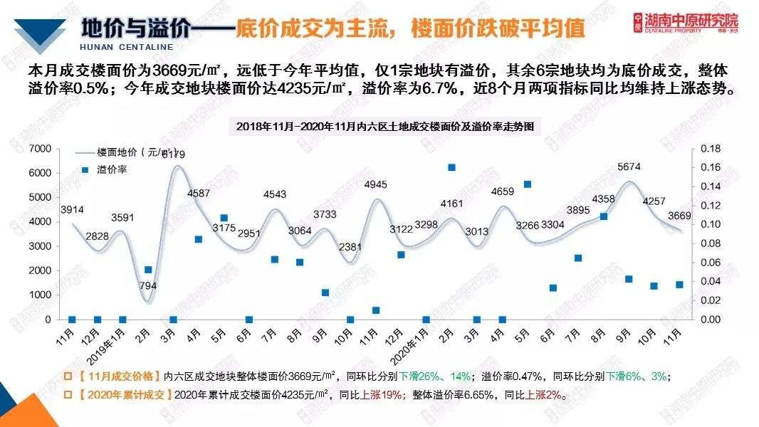 湖南中原研究院的数据表明,2020年1-11月,长沙市内六区累计供应土地宗地面积519万平方米,成交土地494.06万平方米,分别同比下降8%、4%;成交楼面价4235元/平方米,同比上涨19%。