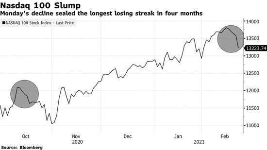 尽管美债收益率短暂下跌,但越来越多的人押注美国经济将在今年晚些时候起飞,这使得纳斯达克100指数——收入了股市中涨幅最高股票的这只股指出现了四个月来持续时间最长的低迷表现。