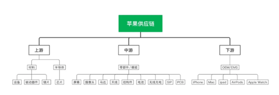 回顾整个苹果供应链,从类别上可以将其分为上、中、下游。