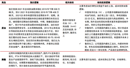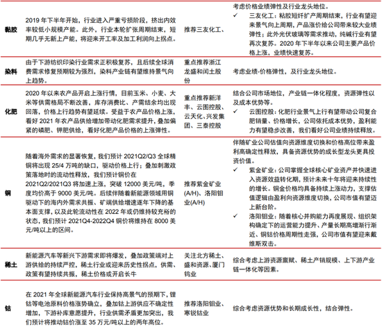 本轮主要工业品价格上涨的支撑因素包括经济恢复推动的需求增长预期、流动性宽松预期及供给端受政策限制或进入低增速阶段等。我们认为,具备供给+需求两方面因素支撑的品种涨价可持续性更强,主要包括原油、化纤聚酯、黏胶、染料、铜、钴、稀土、锂等品种。