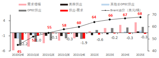 中期来看,油市基本面的脆弱平衡同时受到需求复苏和供应端减产的影响,但供应端压力远小于2020年,看好油价中枢上行至55-60美元/桶。从更长周期来看,2014年以来低资本开支导致全球原油供应潜力不足,2022年前后原油基本面可能呈现供不应求状态,有望成为中长期持续推升油价中枢的主要驱动力。