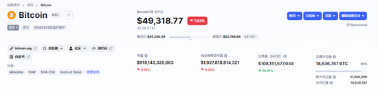 比特币加速下跌,失守50000美元。昨日一度暴跌17%,跌破45000美元,最低至44845美元/枚,较21日创出的历史最高价58354美元跌去了23%,24小时内爆仓金额一度超300亿元人民币。截止发稿,比特币价格为49318.77美元/枚。