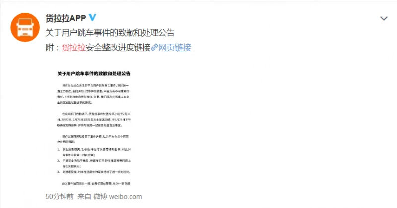2月24日上午,货拉拉官微就23岁女子搬家途中跳车身亡道歉,表示平台负有不可推卸的责任,并感到极度自责与愧疚,再次对当事人车女士的家属致以最诚挚的歉意,并立即推进包括在跟车订单场景中上线强制全程录音功能等安全措施整改。
