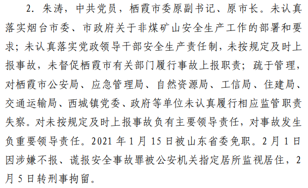2月23日,山东省应急管理厅发布了该起事故调查报告,共50页、3万余字。原栖霞市委书记姚秀霞、原栖霞市市长朱涛的处理结果一并公布。