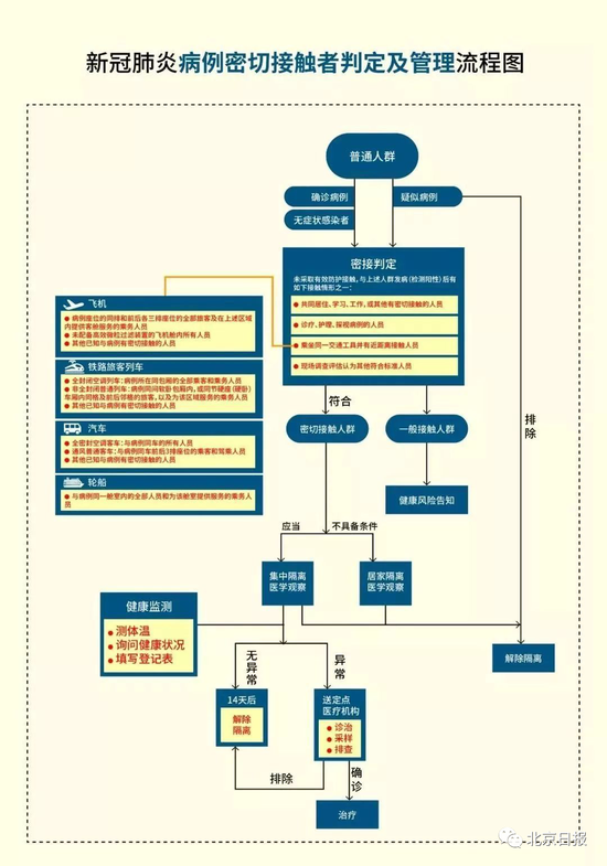 北京市疾病预防控制中心的《新冠肺炎病例密切接触者判定及管理流程图》中给出了答案。