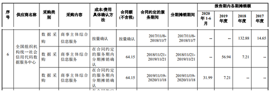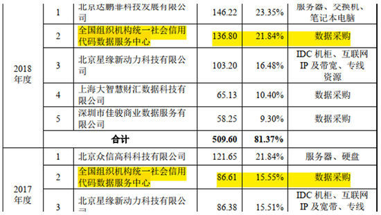 招股说明书显示,中数智汇对外采购内容主要包括三类:IT资源、数据和其他服务。其中全国组织机构统一社会信用代码数据服务中心(下称“组代中心”)为中数智汇数据类主要供应商之一。2017年和2018年,组代中心均为中数智汇的第二大供应商,采购额分别为86.61万元和136.8万元。