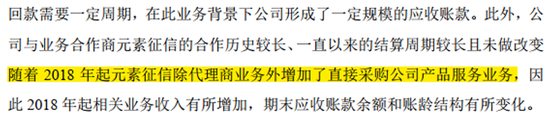 但令人费解的是,招股说明书在分析应收账款的账龄情况时提到:“公司与业务合作商元素征信的合作历史较长,一直以来的结算周期较长且未做改变,随着2018年起元素征信除代理商业务外增加了直接采购公司产品服务业务,因此,2018年起相关业务收入有所增加,期末应收账款余额和账龄结构有所变化。”