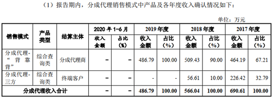招股说明书显示,中数智汇前五大客户之一元素征信系是分成式代理销售模式下的唯一代理商。2017-2019年及2020年上半年,中数智汇对元素征信的销售收入分别为521.06万元、741.76万元、1118.1万元和287.38万元。