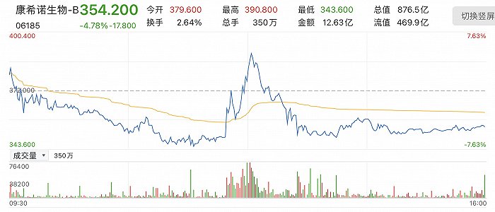 与此同时,康希诺港股股价也出现大幅震荡,当日收盘,该股股价至354.2.港元/股,跌4.78%。